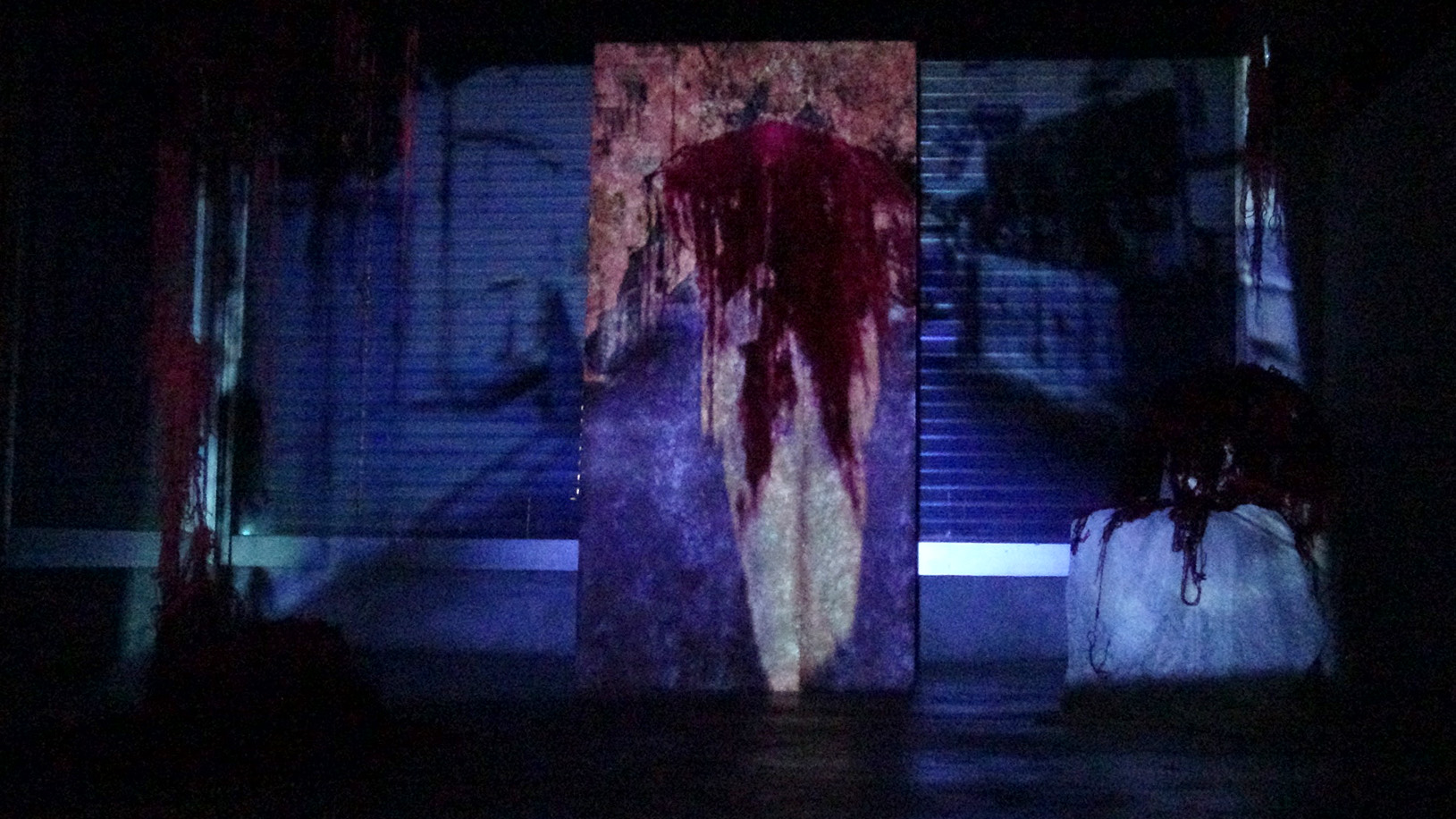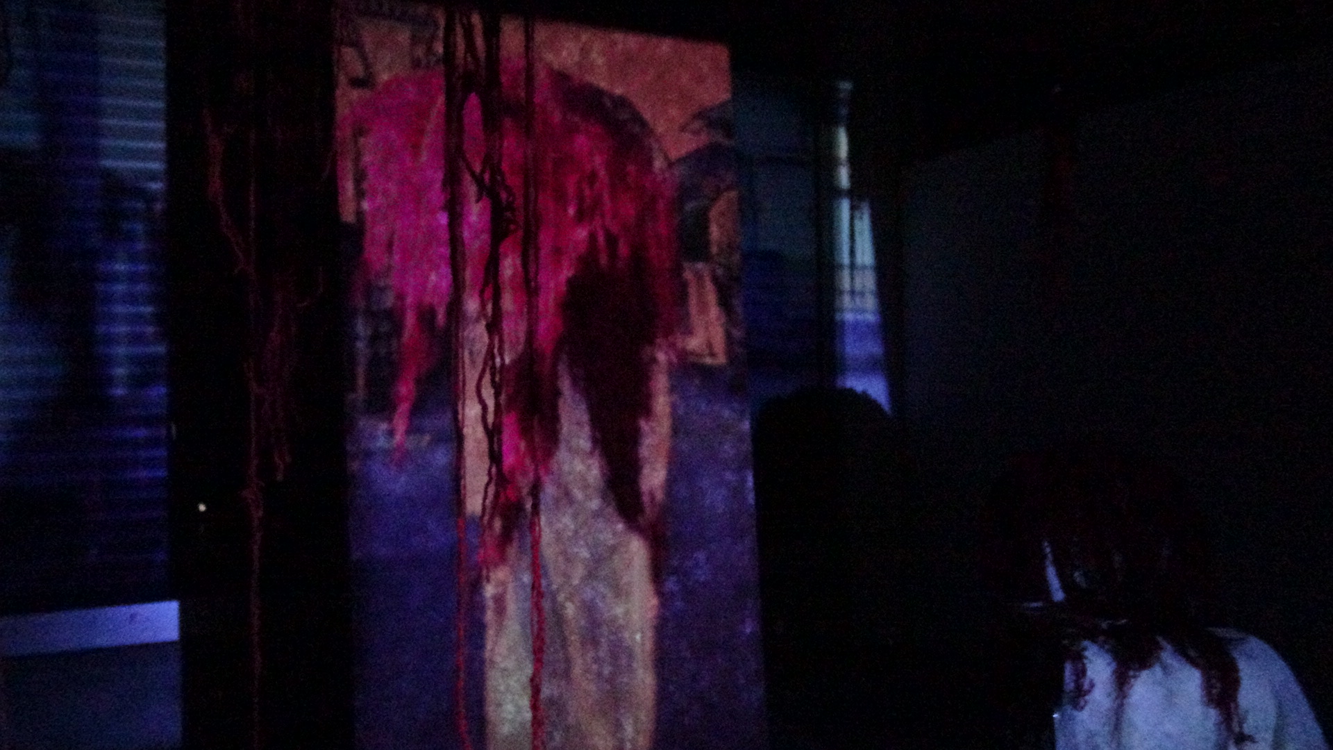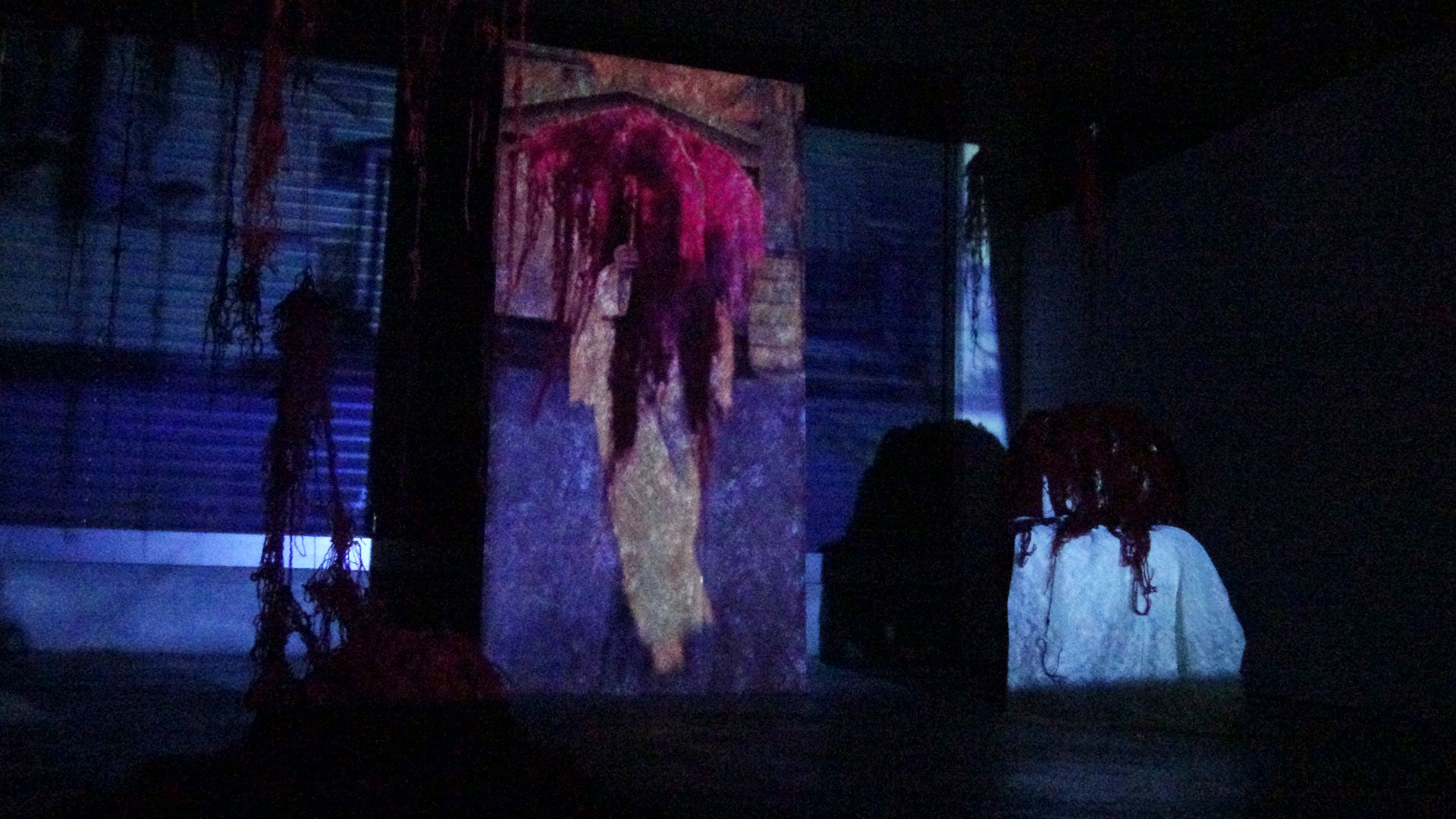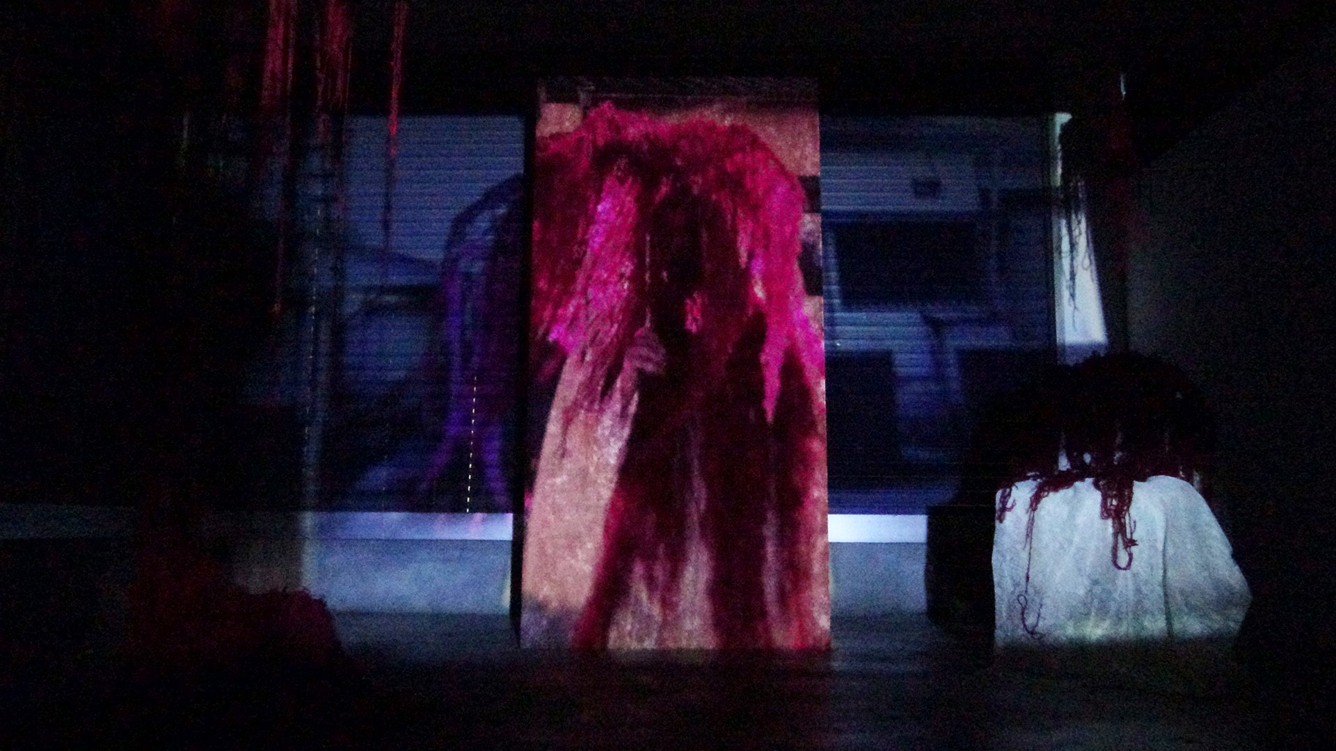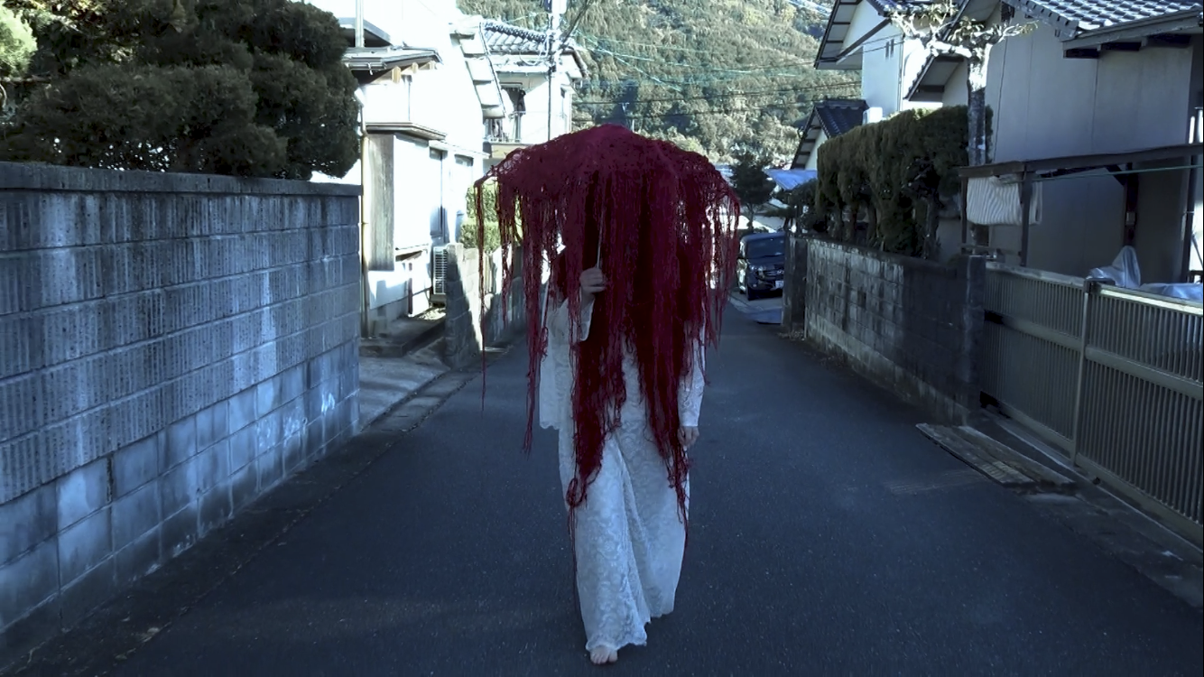 Oiwa is a multimedia installation that incorporates a film within a theatrical environment. This installation was the result of my residency period at Arts Itoya in Takeo, Japan. It was inspired by Japanese Kaiki eiga (weird films) and the rensageki (chain drama) performances from the 1910s. Rensageki are a Japanese hybrid of film and theater in which actors would perform interior sets scenes live and then screen the outside scenes on film. This method of performance emphasizes the mutual connection between theater and cinema and shows how they contain one another. After discovering this hybrid, I began to experiment with another form of presentation that would blend the cinematic and theatrical. Using red yarn and Japanese lace curtains I created a costume and sculptural pieces or props based on the visual iconography of Oiwa, the emblematic long-haired ghost that remains at the root of many Japanese horror media. The video is presented on a screen created with woven red paper. The film is projected onto the screen and the shutters of the exhibition space which isolates the ghostly figure into an obscure screen. Creating an environment that resembles a theatrical stage or a grainy tv screen. The sound that fills the space is made with recordings of the Takeo school bell whose eerie melody rings every day through the city.