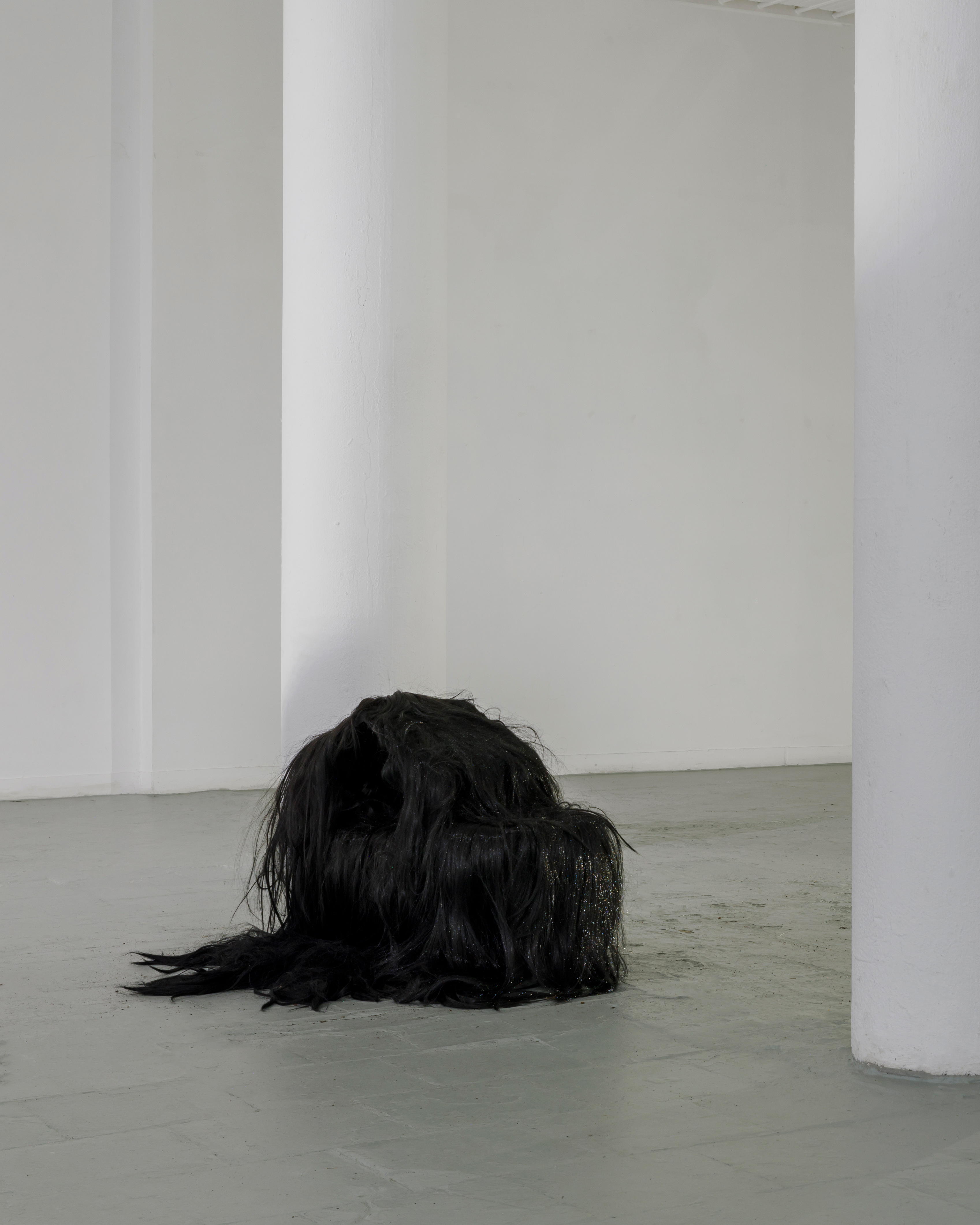 A doll’s house from which unruly black hair grows, a hairy doll wearing a costume with a house embedded in its belly, a video of two obscured legs submerged in water surrounded by seaweed resembling hair, or an embroidery of a house growing out of a tree. The Uncomforted is a multimedia installation that consists of a video, two sculptures, and a work of embroidery that explore discomfort and domesticity. The doll’s house is a place of idealized order, a space where everything is contained and meticulously arranged. Yet, this sense of control feels unsettling as this imposed order contrasts so sharply with the unpredictable and chaotic nature of lived experience. It reflects an ideal, a fantasy that we are meant to inhabit yet never truly live up to. This makes it so uneasy, as it blends our most intimate dreams and fantasies with confinement and discomfort.
